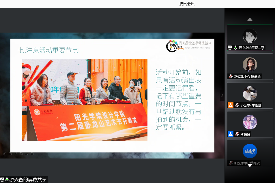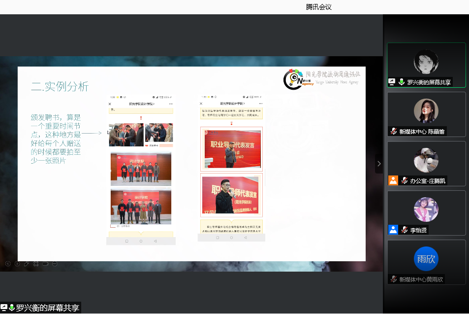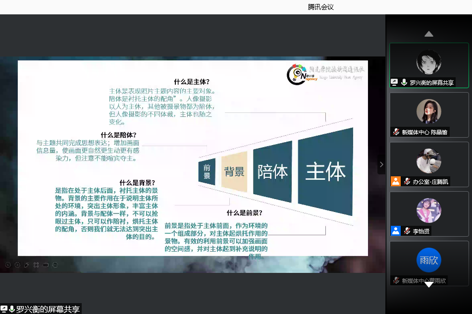 继设计学院2021年干部素质培训寒假训练营第一讲的成功举办,第二讲邀请了bwin必赢新闻通讯社副部长罗兴衡同学于2021年1月20日晚上通过腾讯会议为设计学院全体干部干事做《提高摄影技巧》专题培训,设计学院办公室主任兼团委书记吴其枝、设计学院团委员工会全体干部干事参加培训,会议由设计学院办公室主任庄腾凯主持。