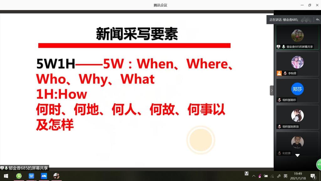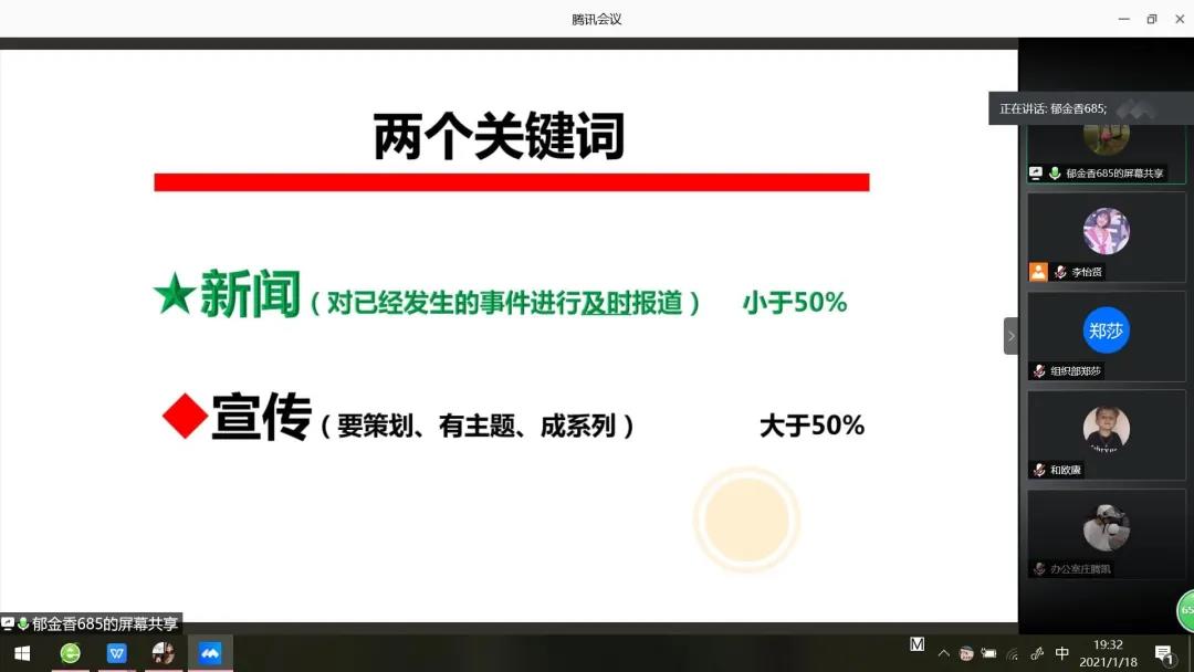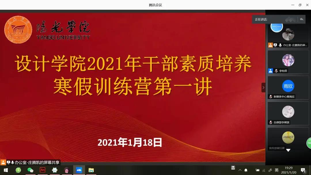 为了提高设计学院团委员工干部综合素质,特举办2021年干部素质培养寒假训练营。第一讲邀请设计公司党总支书记宋海霞,于2021年1月18日晚上通过腾讯会议为设计学院全体干部干事做《如何做好新闻宣传工作》的专题培训,设计学院办公室主任兼团委书记吴其枝、设计学院团委员工会全体干部干事主席团共166人参加培训,会议由设计学院员工团委副书记李怡贤主持。