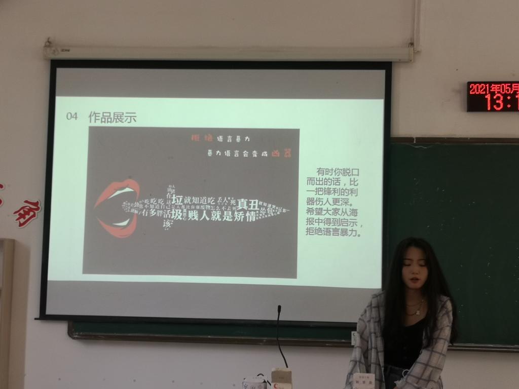 比赛伊始,14位选手从76份初赛作品中脱颖而出,决赛开始每位参赛选手依次进行作品说明,演讲内容发人深省,引人深思,借助PPT展示精彩逼真,富于变化的作品,通过现场展示设计者表达了创作思想,突出了创意理念,展示了创新风采。《拒绝语言暴力》、《保护水质众在行动》、《语言暴力系列海报》等作品设计与民生生活相贴近,使人们的生活更加便利化与智能化;《情感》、《时空系列》等作品设计作品轻巧、便携,突出作品成果的实用性;《线牵木偶系列作品》、《庆祝建党100周年》、《守护》等作品具有强烈的视觉冲击力,有着强烈的视觉感染力;还有的作品整体效果统一、自然,结构布局合理。参赛选手饱满的热情和优秀的作品展示给现场每一位评委和观众带来一场视觉盛宴。每一位选手的设计理念和创意理念,赢得了现场观众的阵阵掌声。