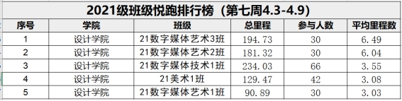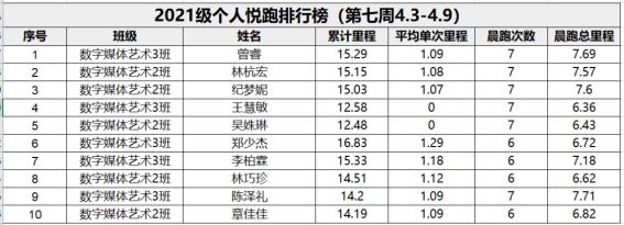 根据《bwin必赢关于开展2022年悦跑排位赛的通知》,每周通过“步道乐跑”APP中显示的班级平均里程数,公司对本周参与悦跑的班级进行排名。现将2021级、2020级排名前5名的班级以及优秀悦跑个人公示: