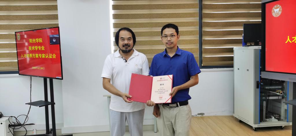 设计学院学科带头人翁炳峰教授为新增补的学术委员会成员赖文辉总经理颁发学术委员会聘书,并向专家简要介绍了公司美术学和数字媒体技术2个专业的办学历程。公共艺术系系主任谭金平对美术学专业培养方案修订背景及方案起草的前期工作进行了汇报、数字媒体系系主任高霞对数字媒体技术专业培养方案修订背景及方案起草的前期工作进行了汇报。