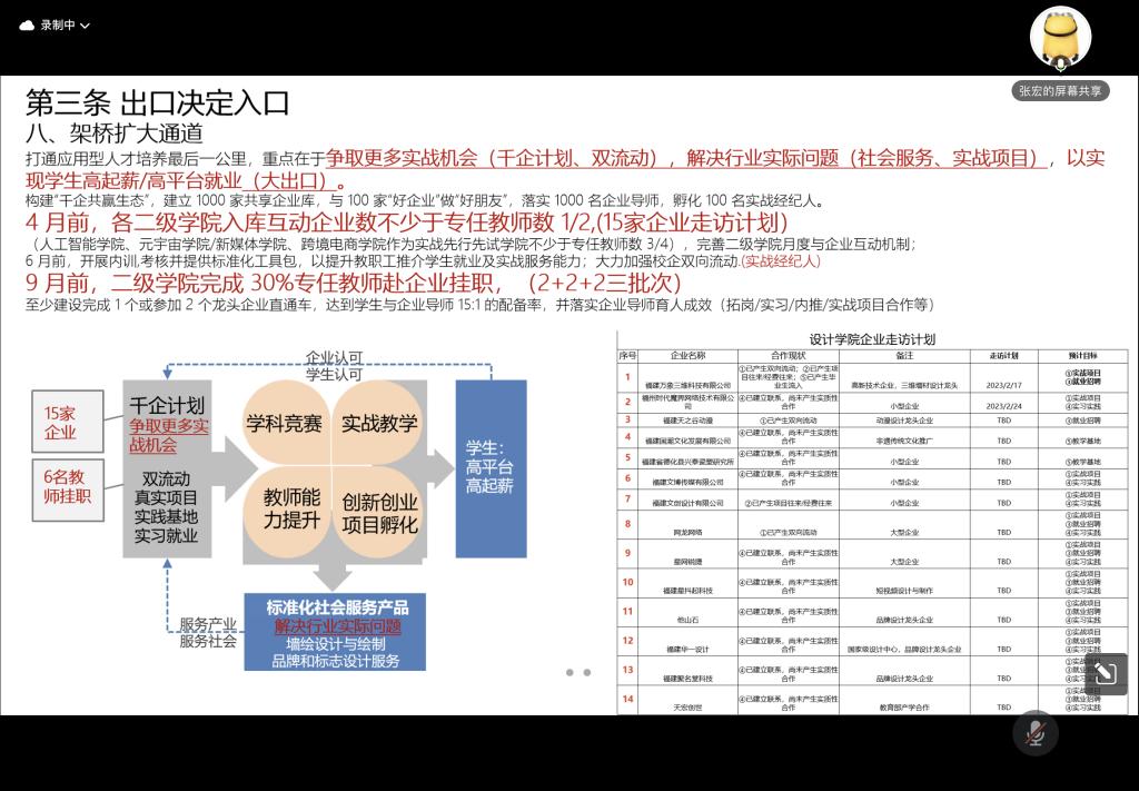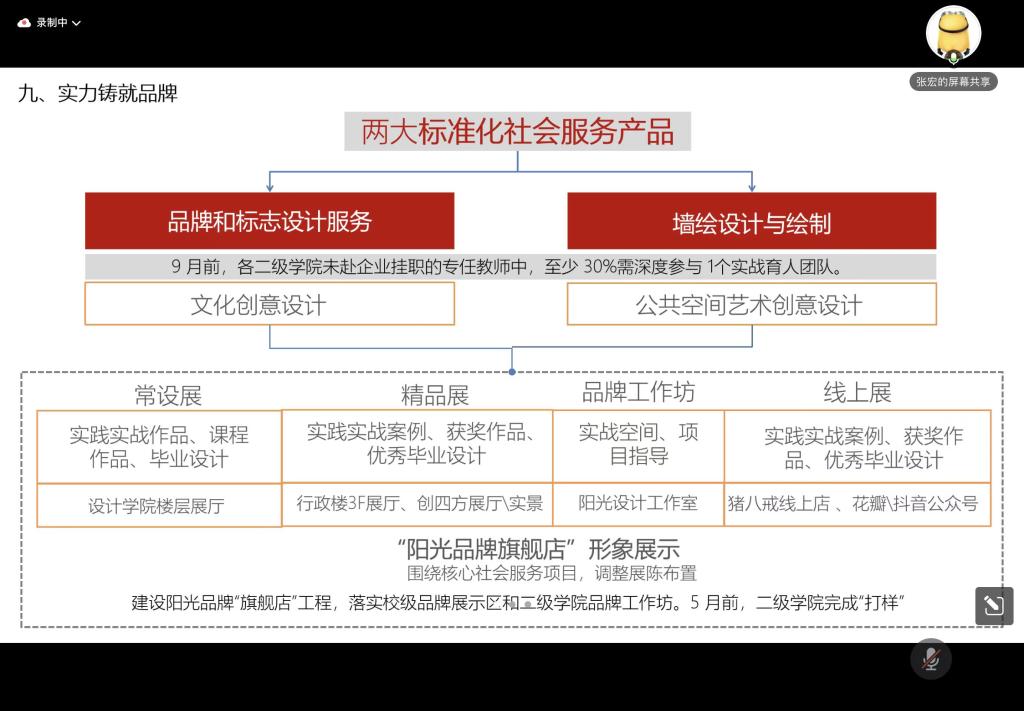 经理助理张宏梳理“大出口”工作布局,将“学科竞赛、实战教学、教师能力提升、创新创业项目孵化”四项工作紧密连接,以形成“回馈社会-可解决行业实际问题,赋能员工-实现高起薪/高平台就业,收获企业、员工认可”的良性出口循环。通过设计学院品牌“旗舰店”进行展示,得以进一步扩大学院、学校社会影响力,以开展符合产业需求、更多实战机会的公司产品,展示打通应用型人才培养最后一公里。