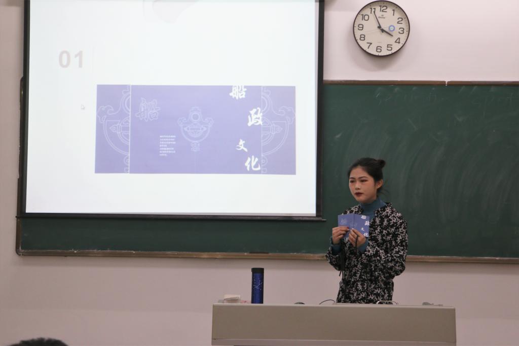 比赛伊始,主持人向观众介绍本次大赛流程以及评比细则,接着由参赛选手依次结合自己作品的设计理念进行演讲。各位参赛选手带来的创意作品各异不同,其中有参赛选手徐泽丽团队,他们共同完成的作品《船政景泰蓝》利用简单的材料结合现代科技和传统工艺,向我们展示了传统建筑罗星塔和昭忠祠,通过景泰蓝的表现,让这两个传统建筑焕发了新生命。参赛选手马强强则是将扁平化插画与纪念品结合,设计出抱枕、环保纸质手提袋与钥匙扣。他用的作品告诉我们用创意发现生活,发现美,设计为生活服务。参赛选手俞晓倩采用传统水纹设计出套书签,结合马尾船政文化的帆船,表达出一帆风顺的意思,用火红的日出,象征着设计蒸蒸日上。参赛选手陈智铭把校徽和设计学院字样融合在钥匙扣上,用多种色彩、元素展示出设计学子的风采。让我们能够感受学习的趣味性,更加生动有趣。