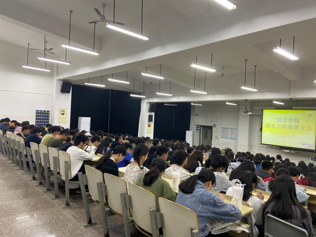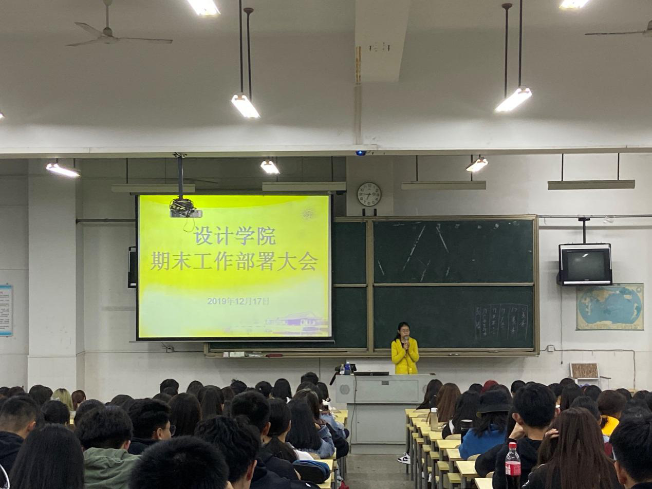 2019年12月17日晚上18:30,设计学院辅导员吴其枝老师在文科楼东1教室组织召开设计学院期末工作部署大会暨设计学院温书迎考动员大会。设计学院2019级全体同学及2017级美术学专业全体同学参会。
