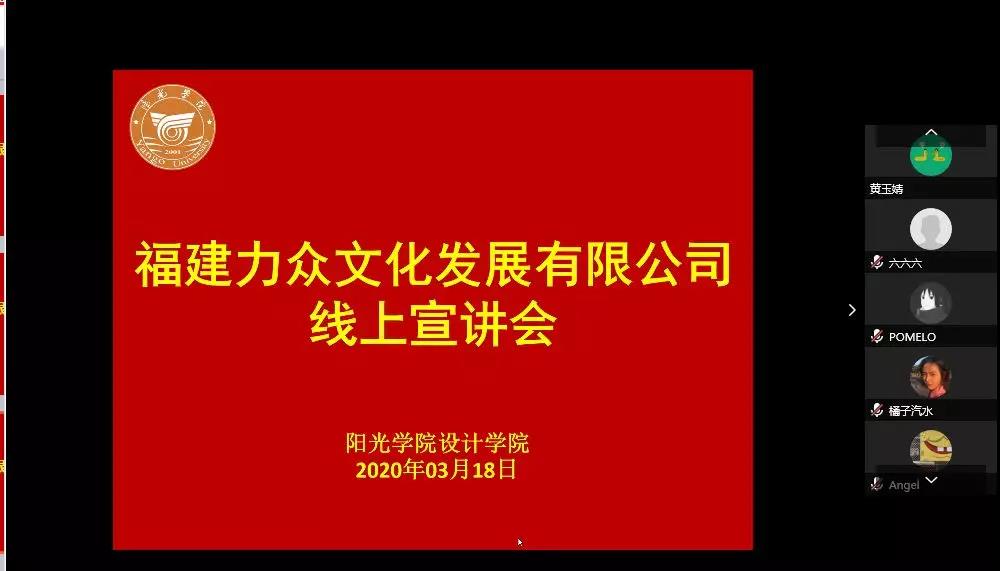 受新冠肺炎疫情影响,2020届毕业生的就业工作受到前所未有的挑战。经设计学院信息会研究,决定开启线上专场招聘会,并积极推荐企业面向本院毕业生招聘。3月18日下午,首场专场招聘通过腾讯会议展开,设计学院办公室主任兼毕业班辅导员吴其枝主持会议,福建⼒众⽂化发展有限公司创始人张兆升总经理等人出席。