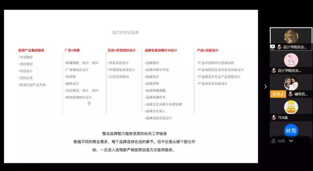 线上专场招聘会首先由福建力众文化发展有限公司创始人张总经理进行企业宣讲会,张总经理详细介绍公司简介和招聘岗要求。福建⼒众⽂化发展有限公司是一家立志于打造真正的品牌全案服务公司,长期致力于研究企业战略、品牌战略、产品规划。在品牌服务的过程中整合企业管理、品牌规划、营销运营、产品开发以及广告创意到包装设计的全案服务,专注品牌研究,为客户解决品牌经营的根本问题。