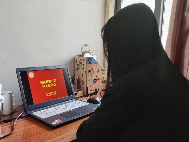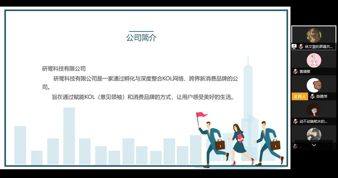 会上,毕业班辅导员代表设计学院对贵单位的热情招聘致以崇高的敬意与真诚的感谢。并对本次专场招聘会具体流程做主持介绍。随后,由研鹭(福建)科技有限公司副总韦梅芳女士进行企业文化和招聘岗位宣讲,使同学们隔着屏幕也能感受到公司浓厚的企业文化和精神内涵。