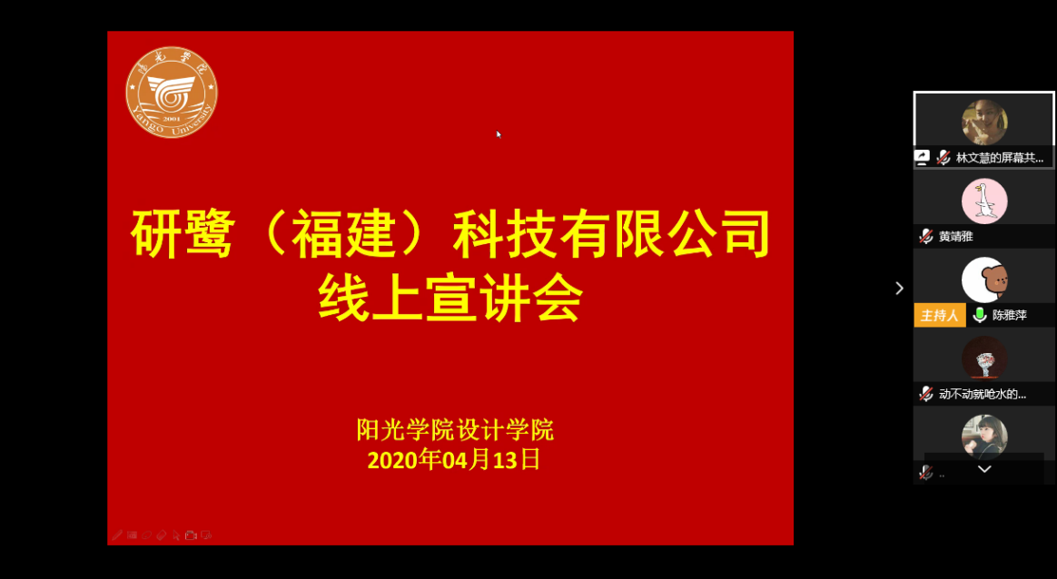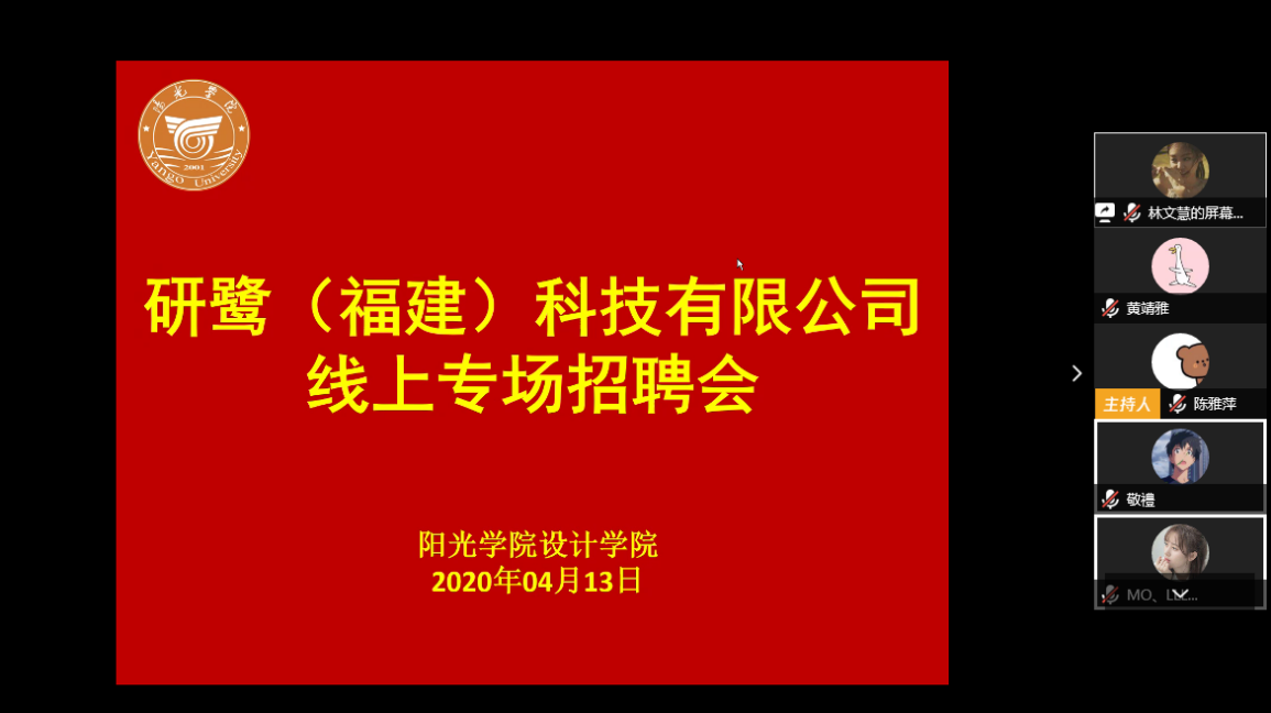 为了做好2020届毕业生高质量就业,实现企业优质服务育人,解决毕业生就业实际困难,加强高校与企业的良性互动。设计学院于4月13日下午,通过腾讯会议的方式召开研鹭(福建)科技有限公司专场招聘会,会议由毕业业班辅导员陈雅萍老师主持,研鹭(福建)科技有限公司副总韦梅芳女士、公司负责人任亚洲先生及设计学院2020届全体毕业生参加。