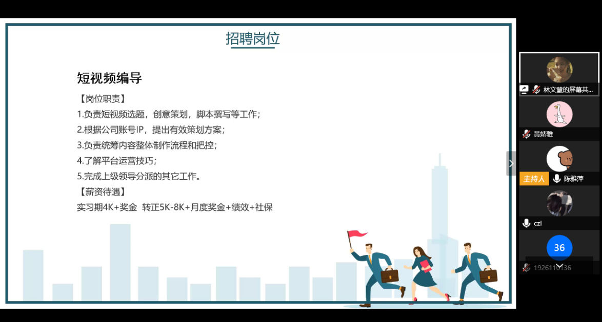 会中,韦梅芳女士详细周到的向毕业班员工介绍公司所要招聘的六大岗位:短视频编导、后期剪辑、运营专员政客服)、社群运营专员、课程顾问及新媒体运营等。并充分说明每个个岗位所需的人才要求和岗位适配度。让同学们明确得知企业的真正需求。宣讲结束进入线上答疑环节,毕业生踊跃提出自己的疑问,研鹭(福建)科技有限公司的相关负责人均为毕业生们逐一解答困惑。诚然,本场招聘会让毕业生更加懂得如何确定自己的职业目标和就业方向。