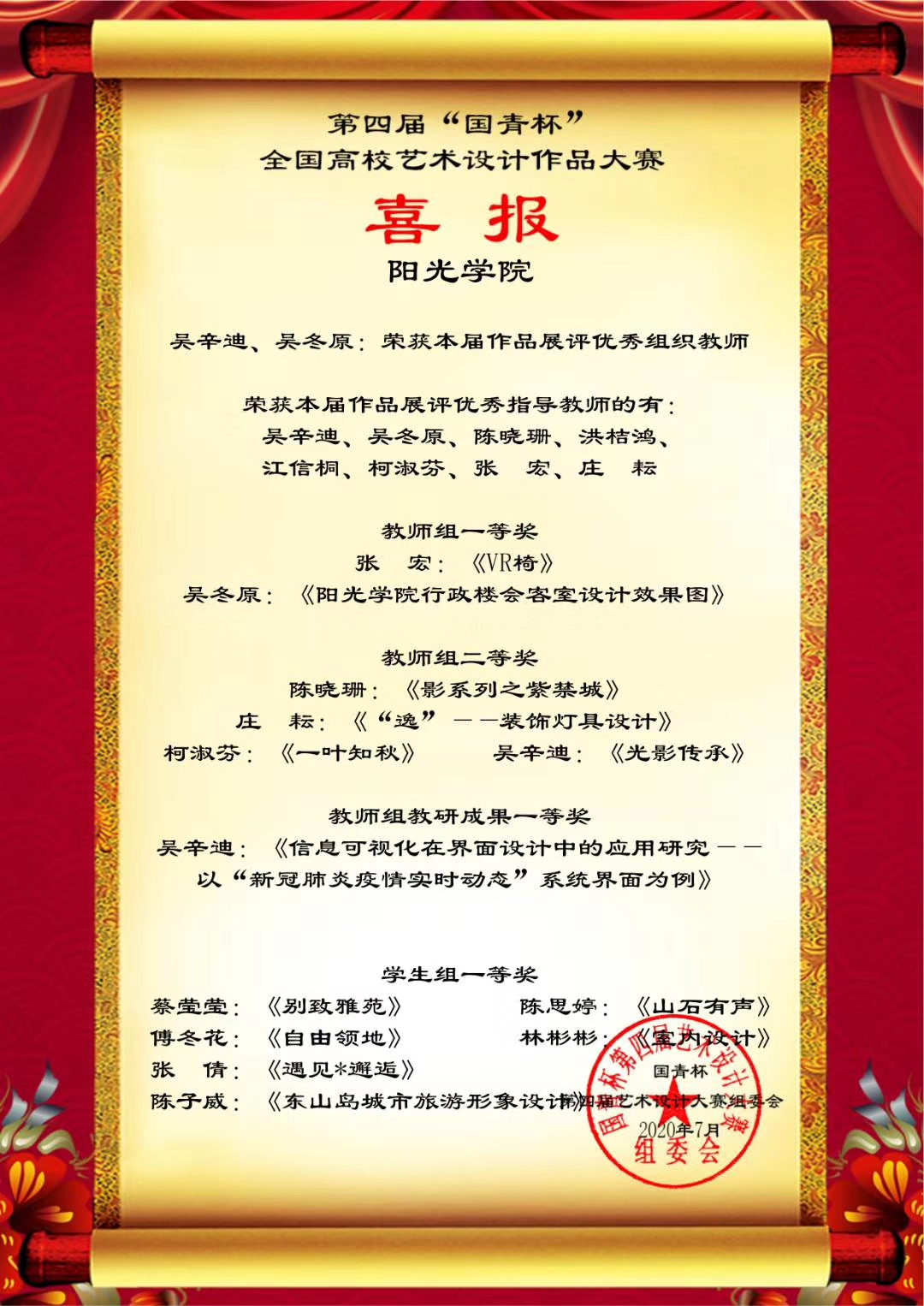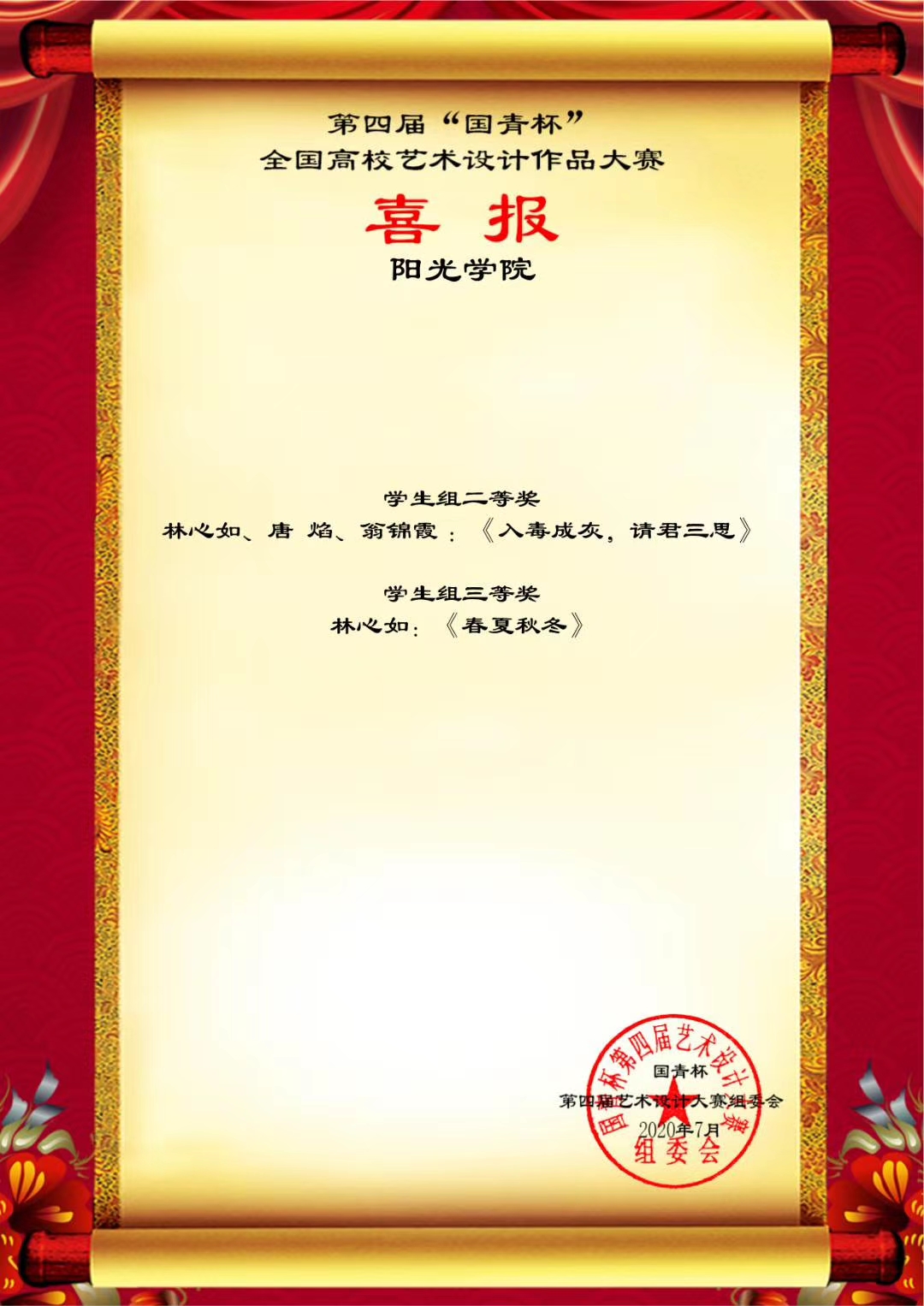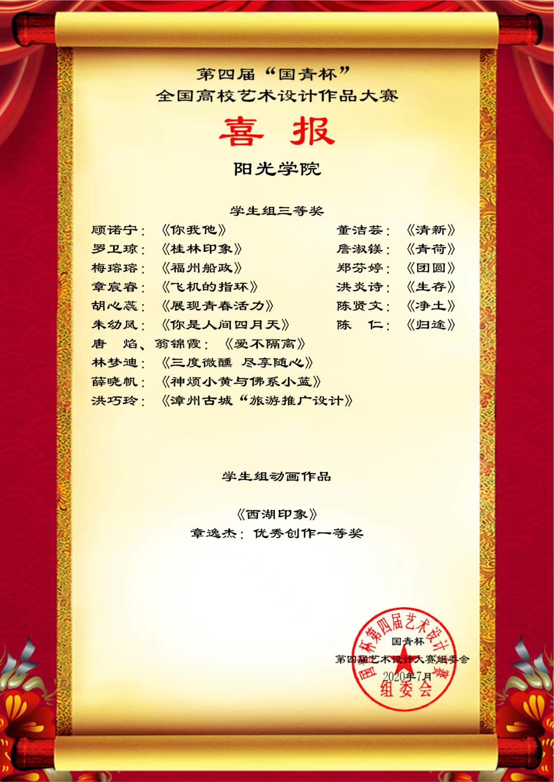 日前,第四届“国青杯”全国高校艺术设计作品大赛结果公布,设计学院师生在评展中荣获多项等级奖。此次线上获奖将获得参加由国青创新教育管理集团、澳门国青商学院等单位主办、承办的第六届中国企业形象建设年会的资格。