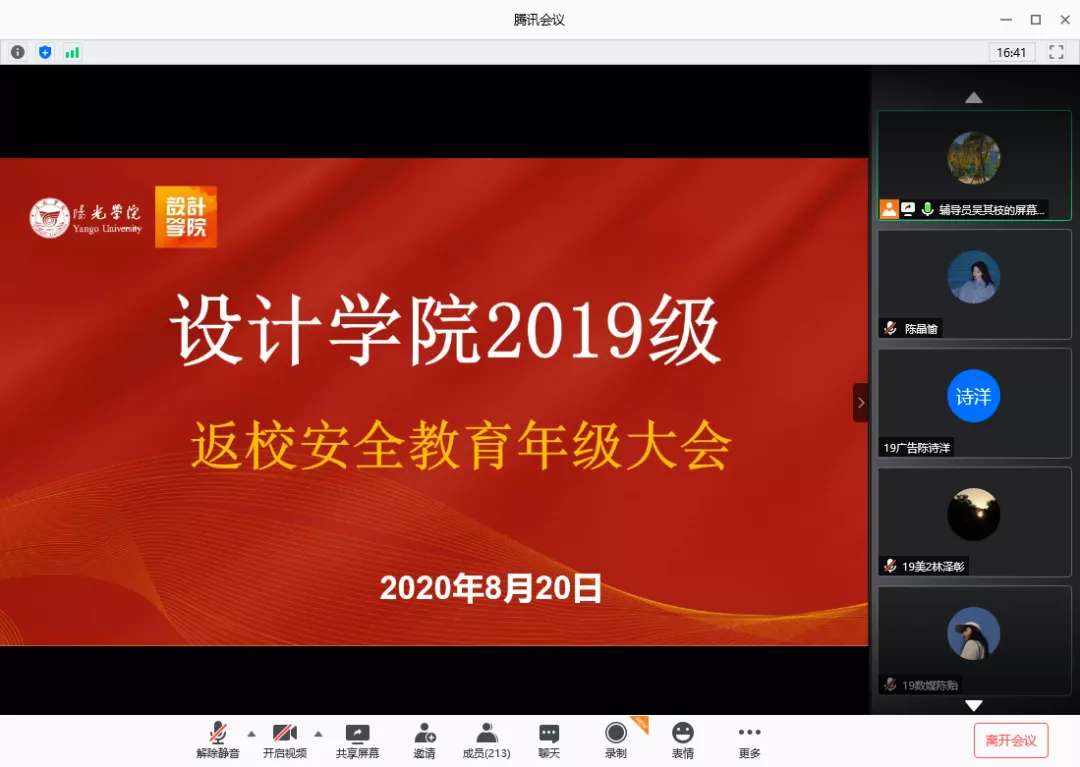 8月19日—20日,设计学院员工辅导员通过腾讯会议的形式,召开返校安全教育年级大会,明确返校的要求及返校前准备、强调返校途中做好自我防护、详细讲解入校流程,要求入校后全体师生共同努力做好疫情防控工作。