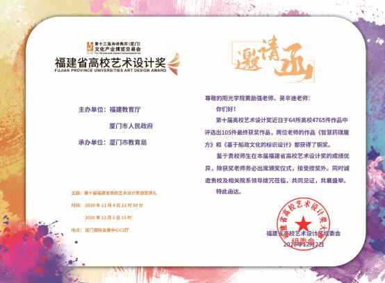 近日,福建省高校艺术设计奖颁奖典礼在厦门国际会展中心隆重举行,设计学院教师黄励强的作品《智慧药理魔方》、教师吴辛迪的作品《基于船政文化的标识设计》分别斩获产品设计类、视觉传达设计类铜奖。