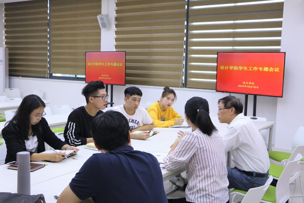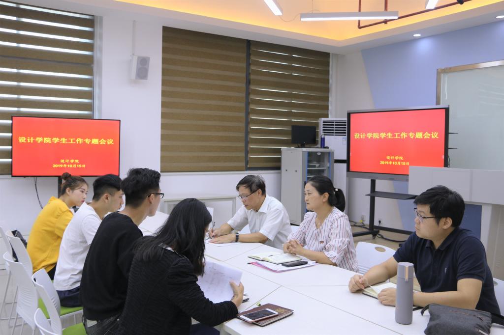 10月15日下午,设计学院在行政综合楼602室召开员工工作专题会议,会议由党总支书记宋海霞主持,副经理卢健涛、经理助理江信桐及全体辅导员参加会议。