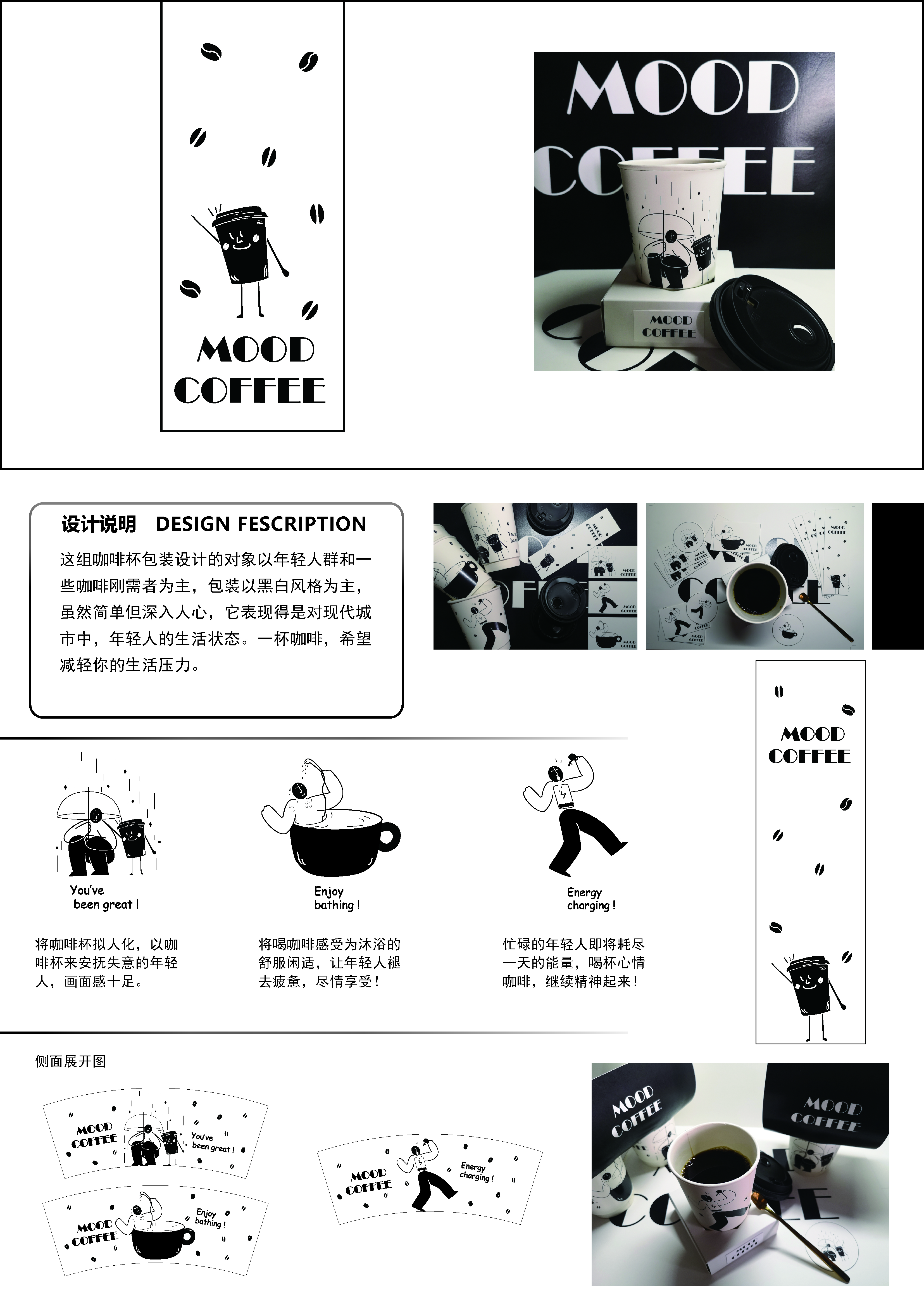 设计说明:这组咖啡杯包装设计的对象以年轻人群和一些咖啡刚需者为主,包装为黑白简约风格,虽然简单但深入人心,它表现得是对现代城市中,年轻人的生活状态。一杯咖啡,希望减轻你的生活压力。