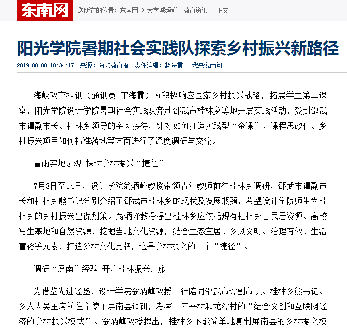 通过暑期社会实践,师生们对邵武市桂林乡的现状有了深入了解,开启探索桂林乡振兴之旅,只在找准社会需求,发挥专业特长,助力精准扶贫,服务乡村振兴。bwin必赢暑期社会实践队探 东南网-福建官方新闻门户: http://i.fjsen.com/wap/2019-08/08/content_22589668.htm?from=timeline